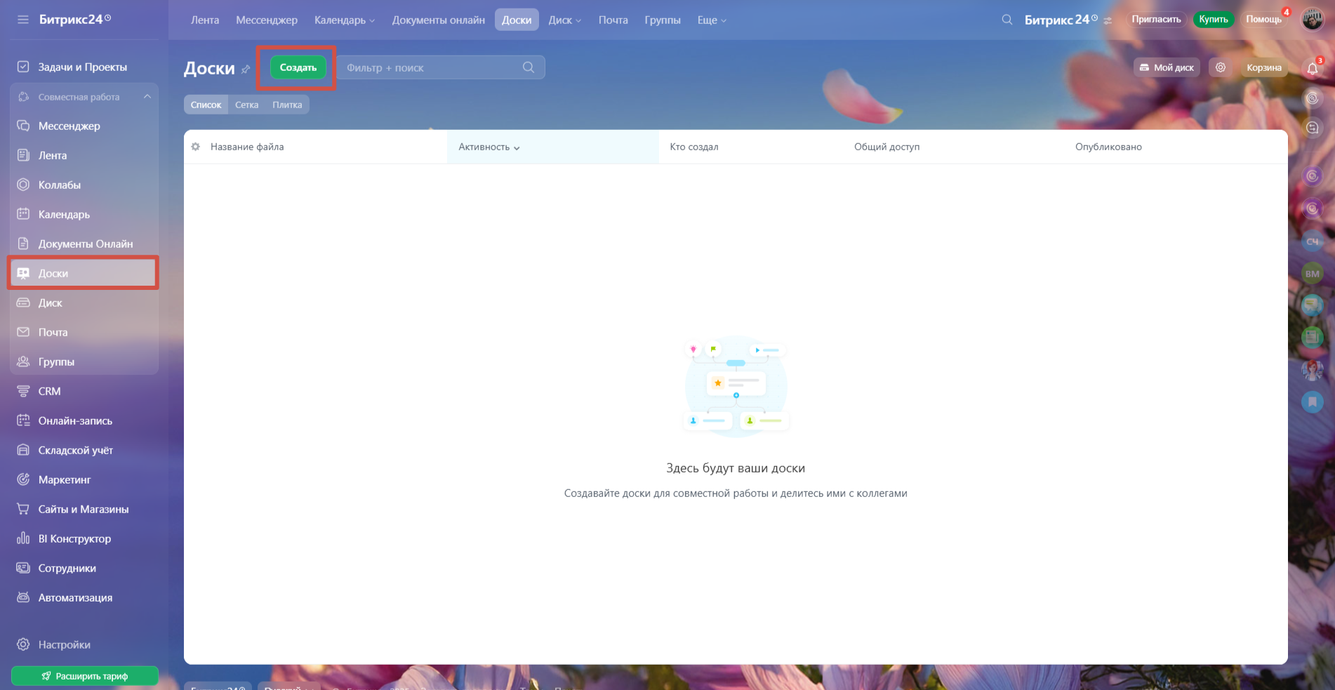 Раздел с досками находится в блоке «Совместная работа». Чтобы создать доску, откройте раздел «Доски» и нажмите кнопку «Создать». Выберите подходящий шаблон или начните с пустой доски, затем настройте ее под задачи вашей команды: добавьте нужные объекты, укажите участников, определите структуру.