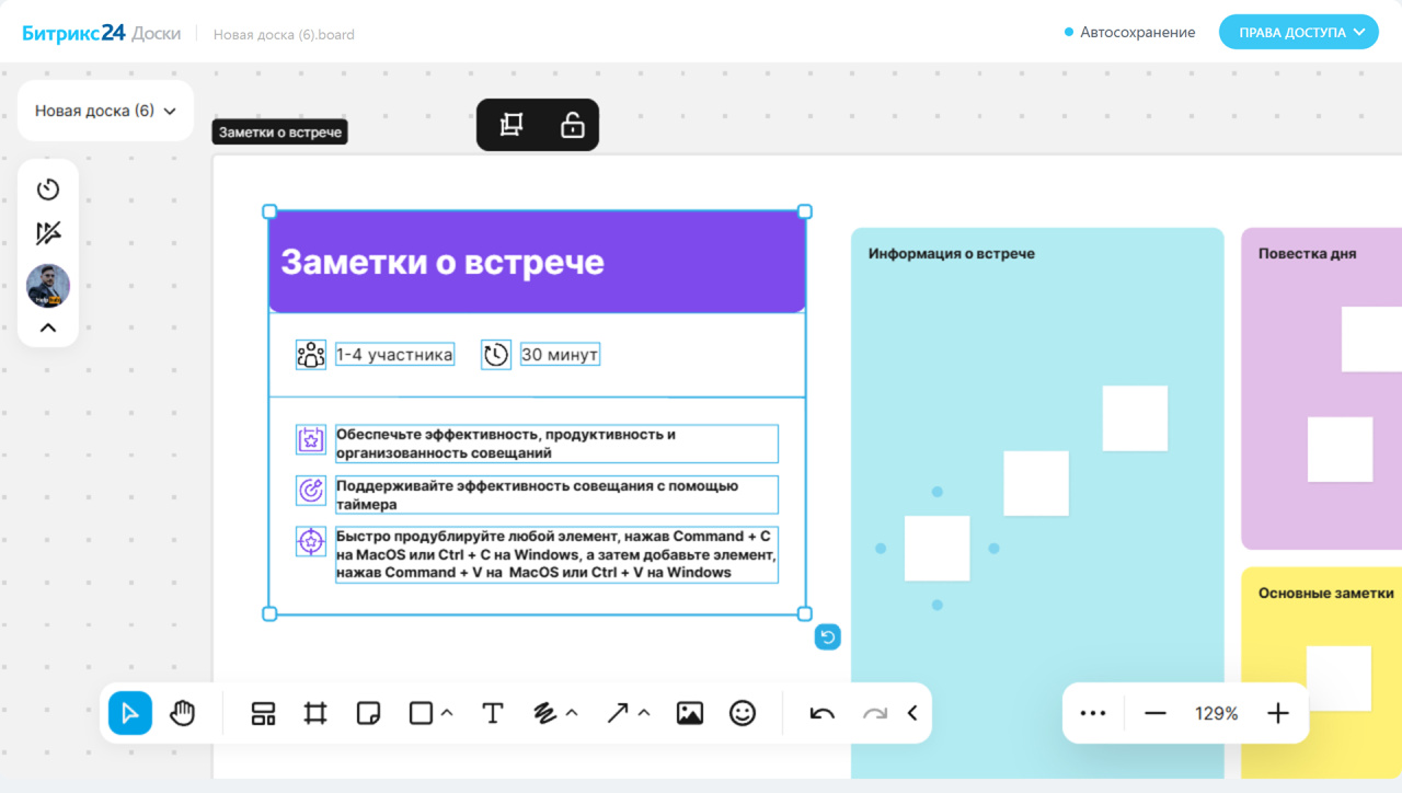 В Досках Битрикс24 можно создавать фреймы — рамки, в которые вы можете группировать контент. Это как слайды, только интерактивные. Можно разбить доску на разделы: например, «идеи», «обсуждение», «выводы».