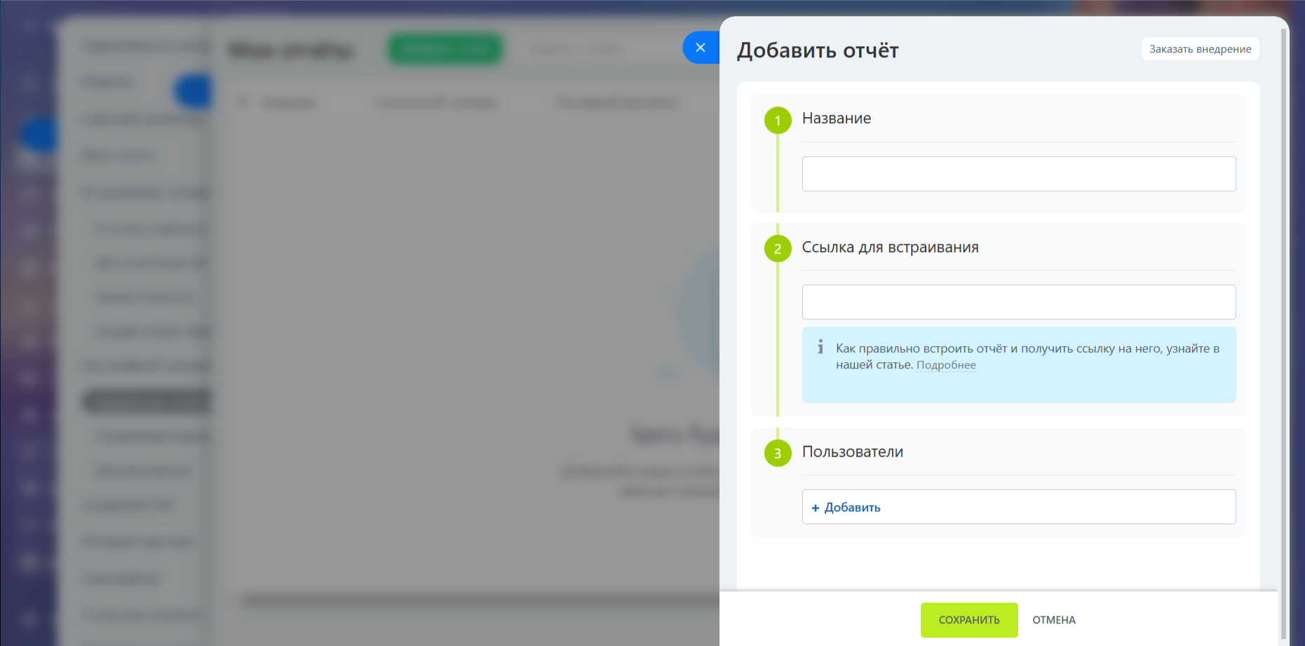 Нажмите кнопку «Добавить отчет», укажите название, вставьте скопированную ссылку и выберите пользователей, которым хотите открыть доступ.