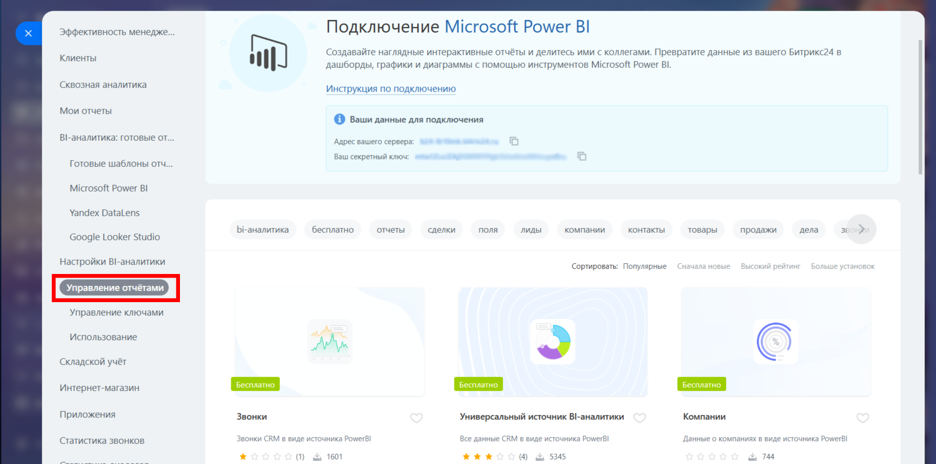 В Power BI скопируйте защищённую ссылку (Secure Embed) вашего отчёта. В Битриксе перейди в BI-аналитику и откройте вкладку Управление отчетами.