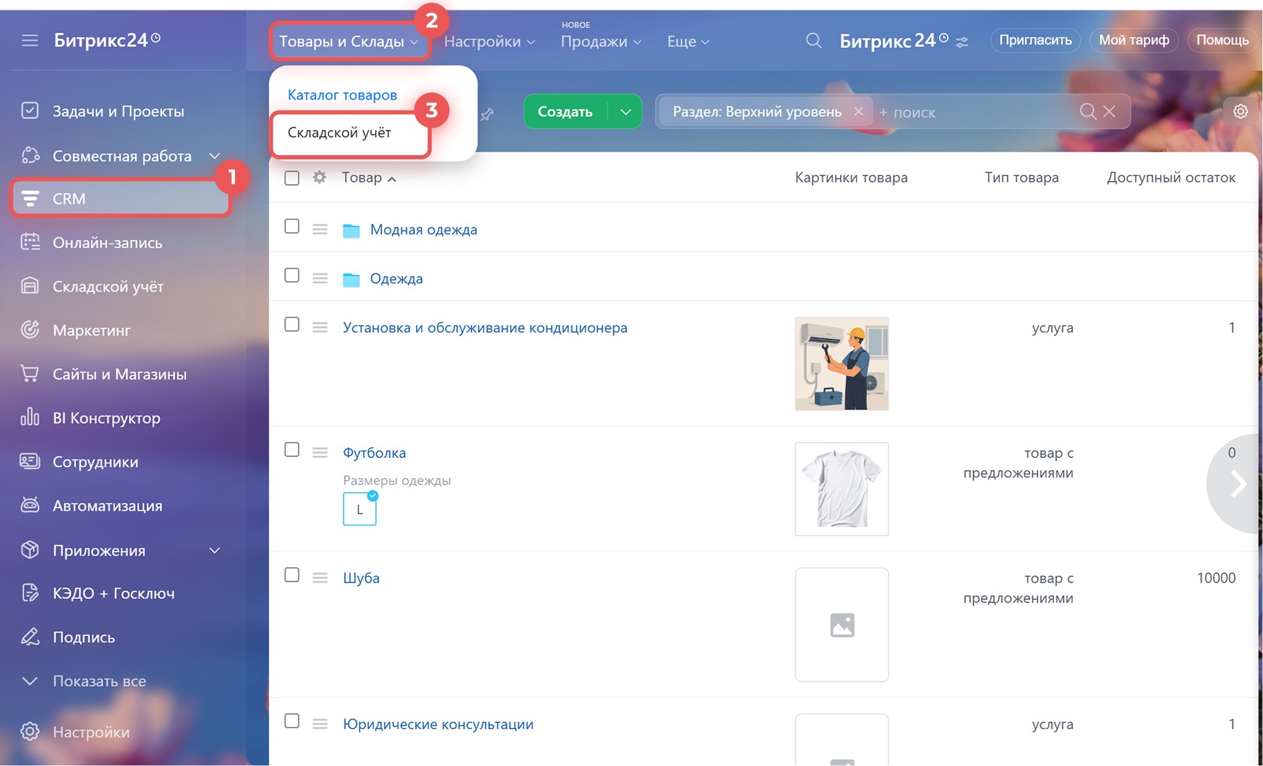 Чтобы включить учет, откройте раздел CRM или Сайты и магазины, затем перейдите в Товары и склады, а далее в Складской учет. Если вы только начинаете, система сразу предложит выбрать режим работы.