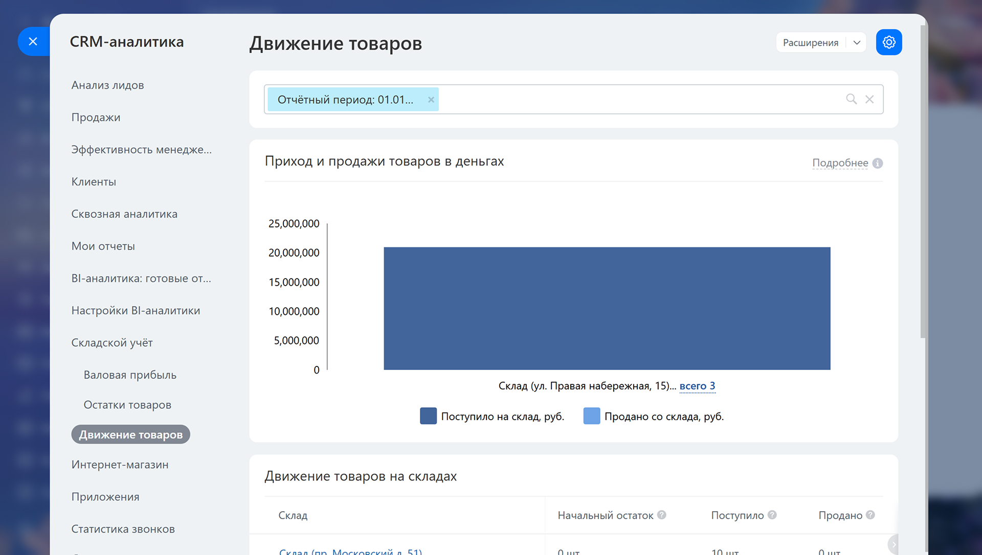 Отчет «Движение товаров» показывает, сколько товаров поступило, сколько продано и как перемещался товар за выбранный период. Он помогает понять, какие позиции продаются быстрее, а какие — медленнее. Эти данные позволяют оптимизировать закупки, снизить расходы и планировать поставки более эффективно.