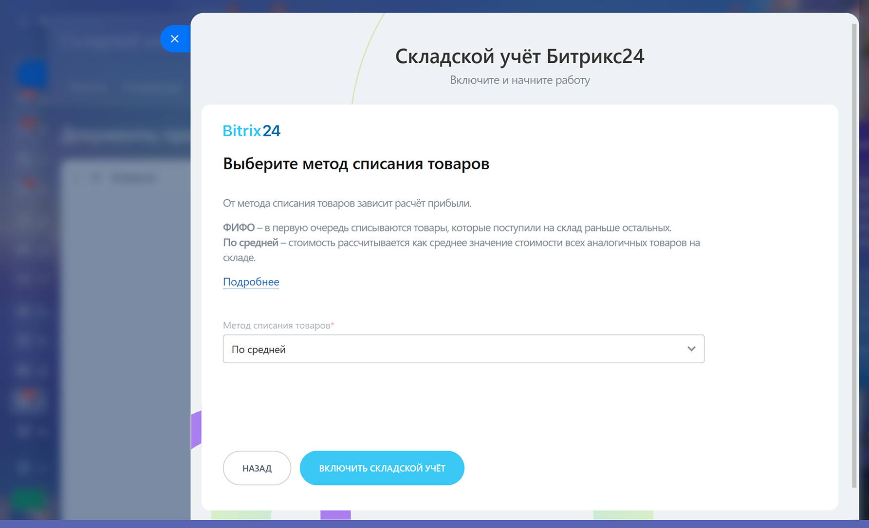 После выбора режима необходимо определиться с методом расчета себестоимости товара, который еще называют методом списания. В Битрикс24 есть два способа: по среднему и по порядку прихода товаров (ФИФО).