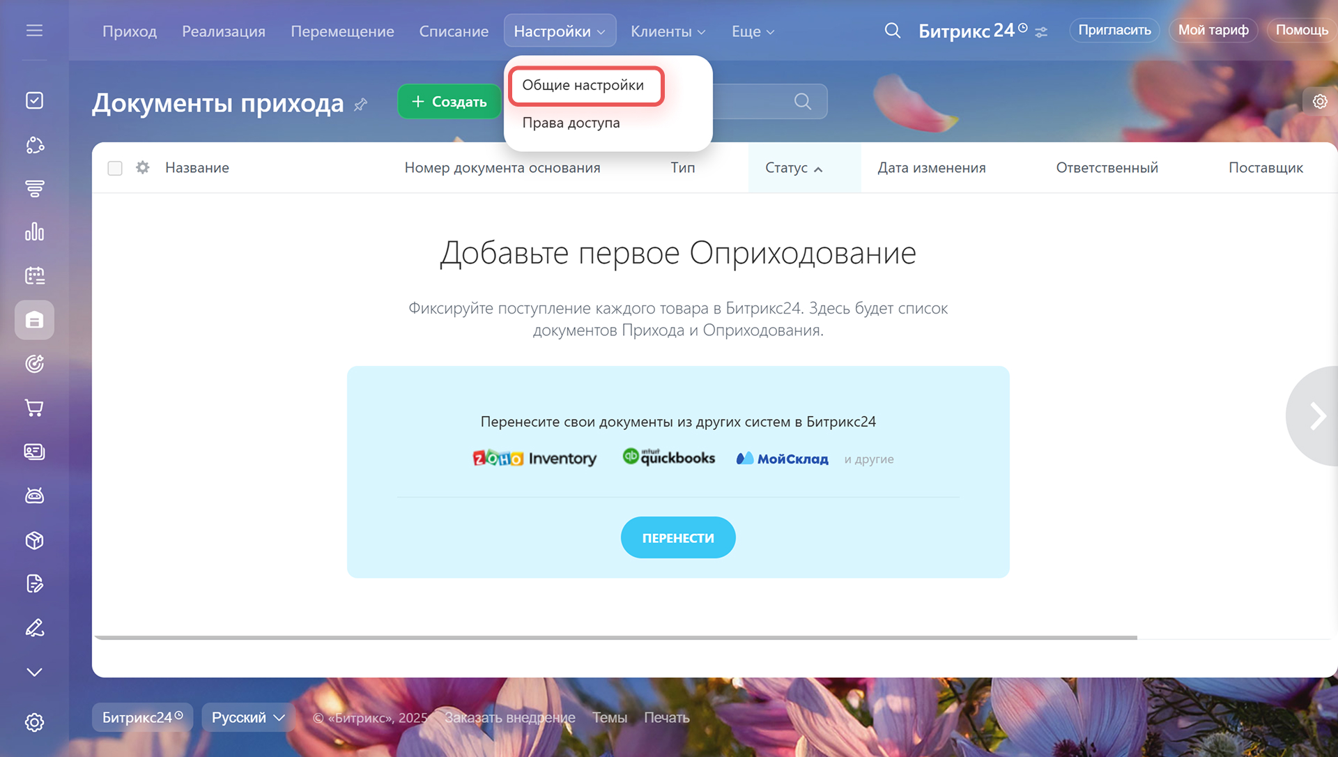 Если по каким-то причинам нужно прекратить работу со складским учетом, это можно сделать через настройки системы. Для этого откройте Складской учет и перейдите в Общие настройки.
