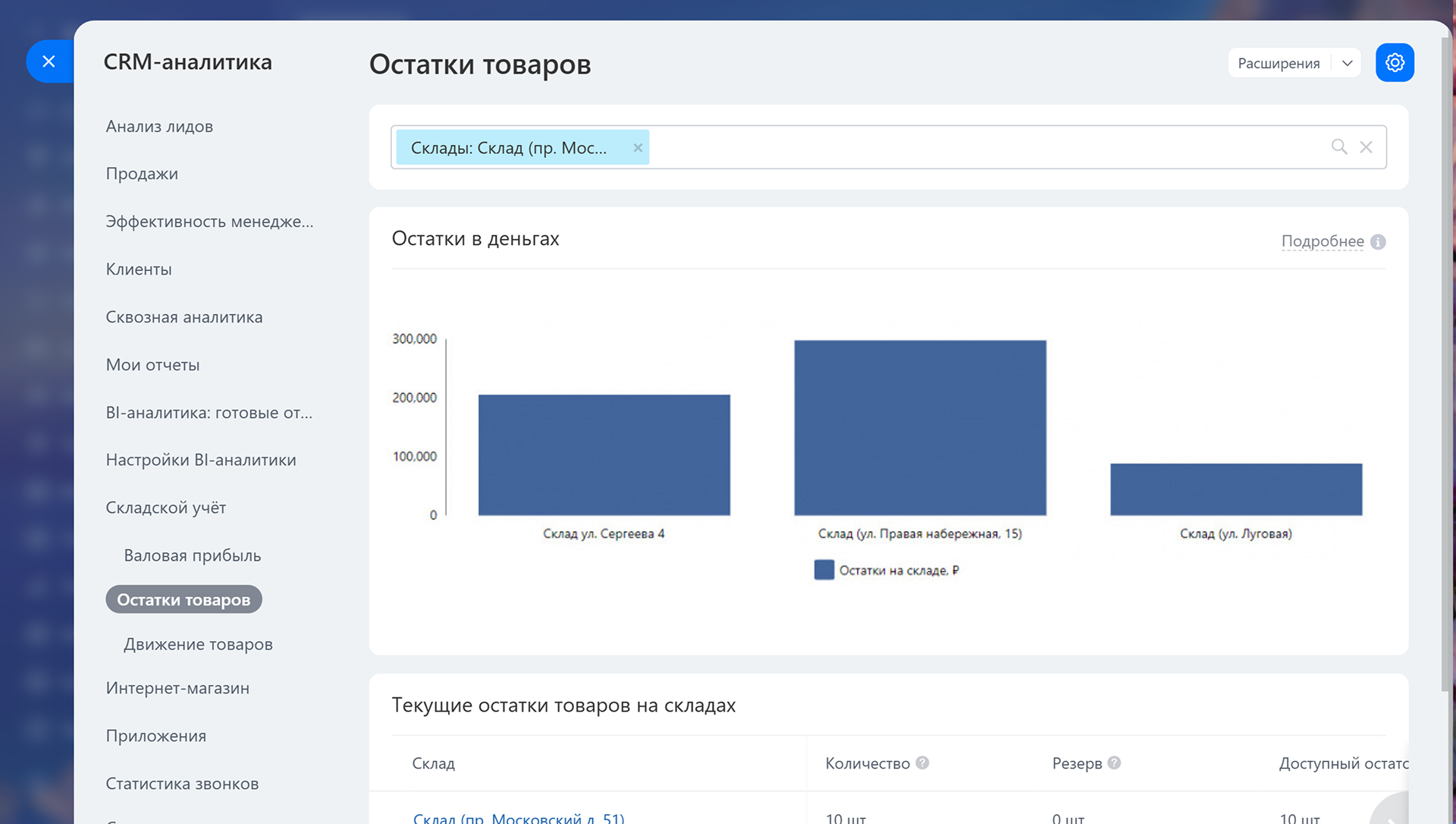 Отчет «Остатки товаров» показывает, сколько товара есть на каждом складе, сколько уже зарезервировано и сколько доступно для продажи. С его помощью вы сразу видите, чего не хватает, и можете вовремя пополнить запасы или переместить товар между складами.