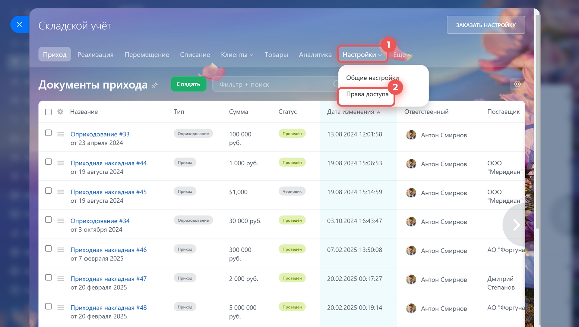 Последний этап — назначение прав сотрудникам. Если у вас небольшая команда и один менеджер работает со всем — выдачей товаров и продажами, дайте ему все права. Если команда большая, настройте права для каждого сотрудника под его задачи. Сделать это можно в настройках.
