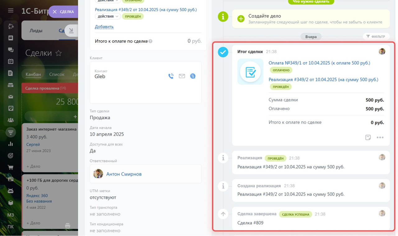 Склад в Битрикс24 тесно интегрирован с CRM, и это сильно упрощает работу с клиентами и товарами. Когда вы закрываете сделку, Битрикс24 сначала проверяет наличие товаров на складе и доступность услуг. Если все в порядке, система автоматически создает документ реализации. Товары списываются со склада, и сделка закрывается.