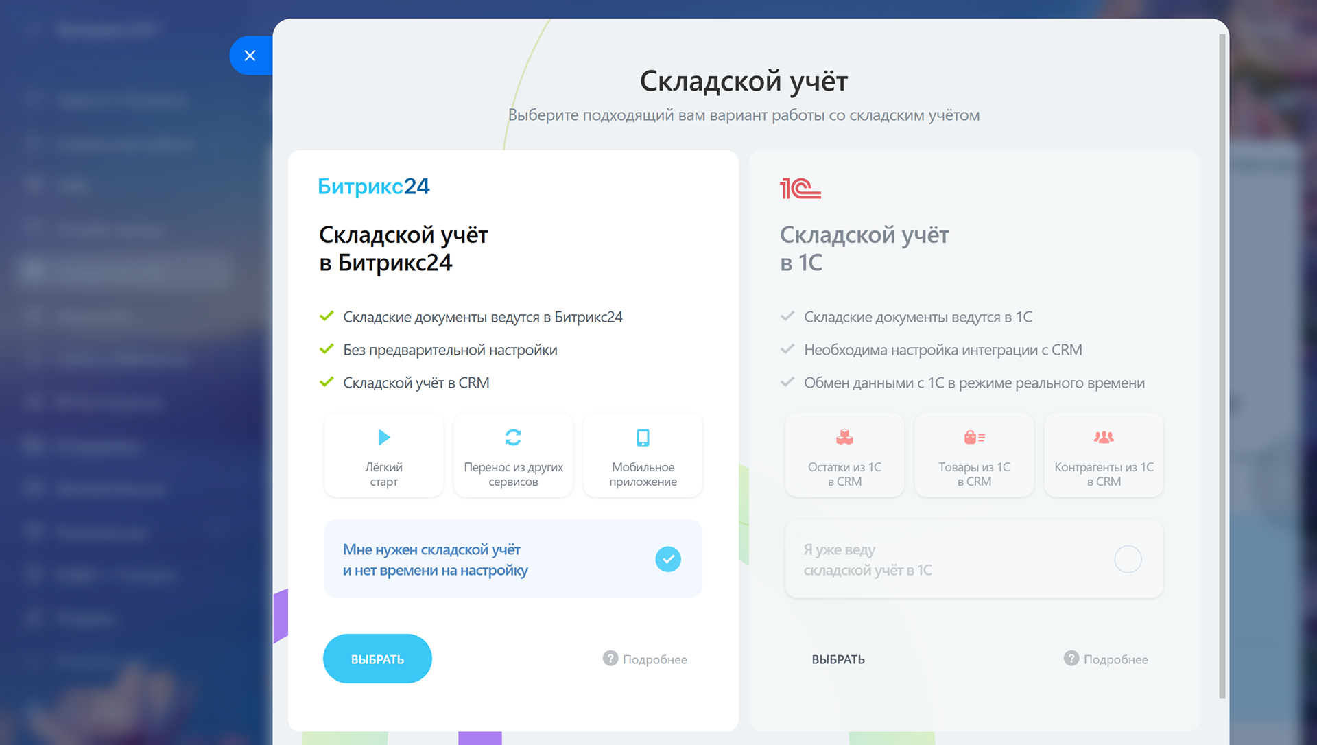 Выбор режима зависит от особенностей вашего бизнеса. Если нужно быстро начать без сложных настроек, подойдет учет в Битрикс24. Если требуется сложная система или вы уже работаете с 1С, выбирайте интеграцию.