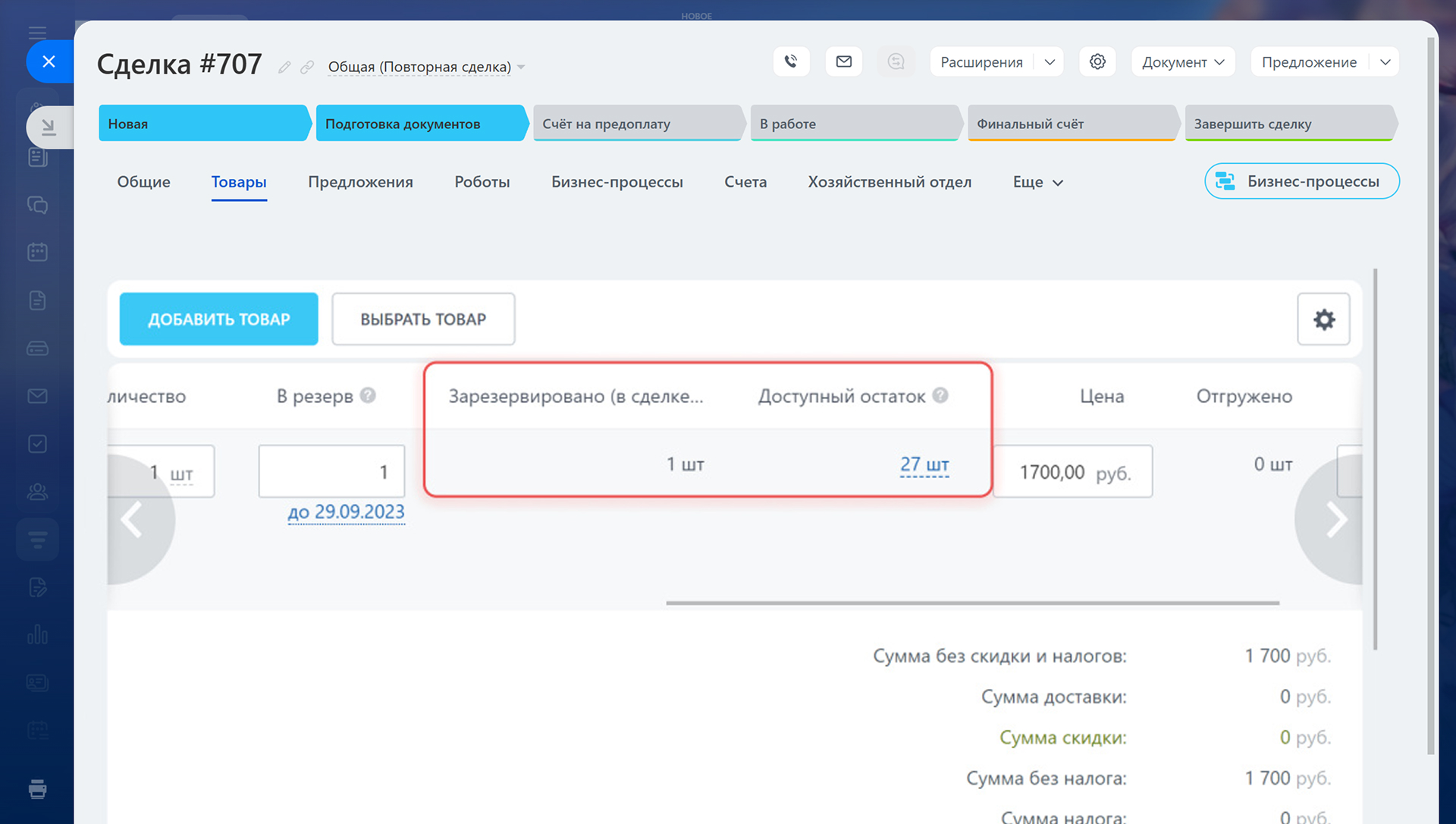 По умолчанию резерв действует три дня, но срок можно изменить, выбрав нужную дату. После резервирования поле Зарезервировано покажет, сколько товара уже забронировано. Резерв снимается автоматически в трех случаях: когда истекает срок резервирования, когда сделка или выбранные товары удалены, или когда сделка переводится на финальную стадию и товар реализуется.