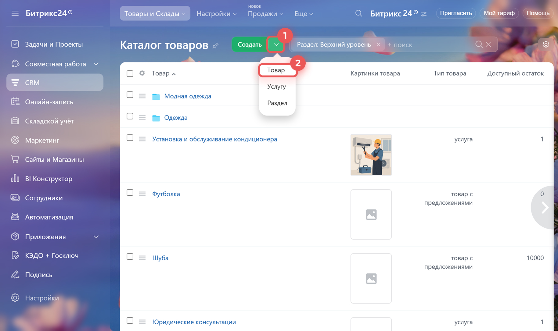 В Битрикс 24 есть два режима: учет прямо в Битрикс24 и интеграция с 1С. В первом случае достаточно создать товары в каталоге и оформить документ прихода. При продаже товаров система автоматически создаст документы реализации и пересчитает остатки. Вы сможете управлять складом и документами как с компьютера, так и через мобильное приложение.