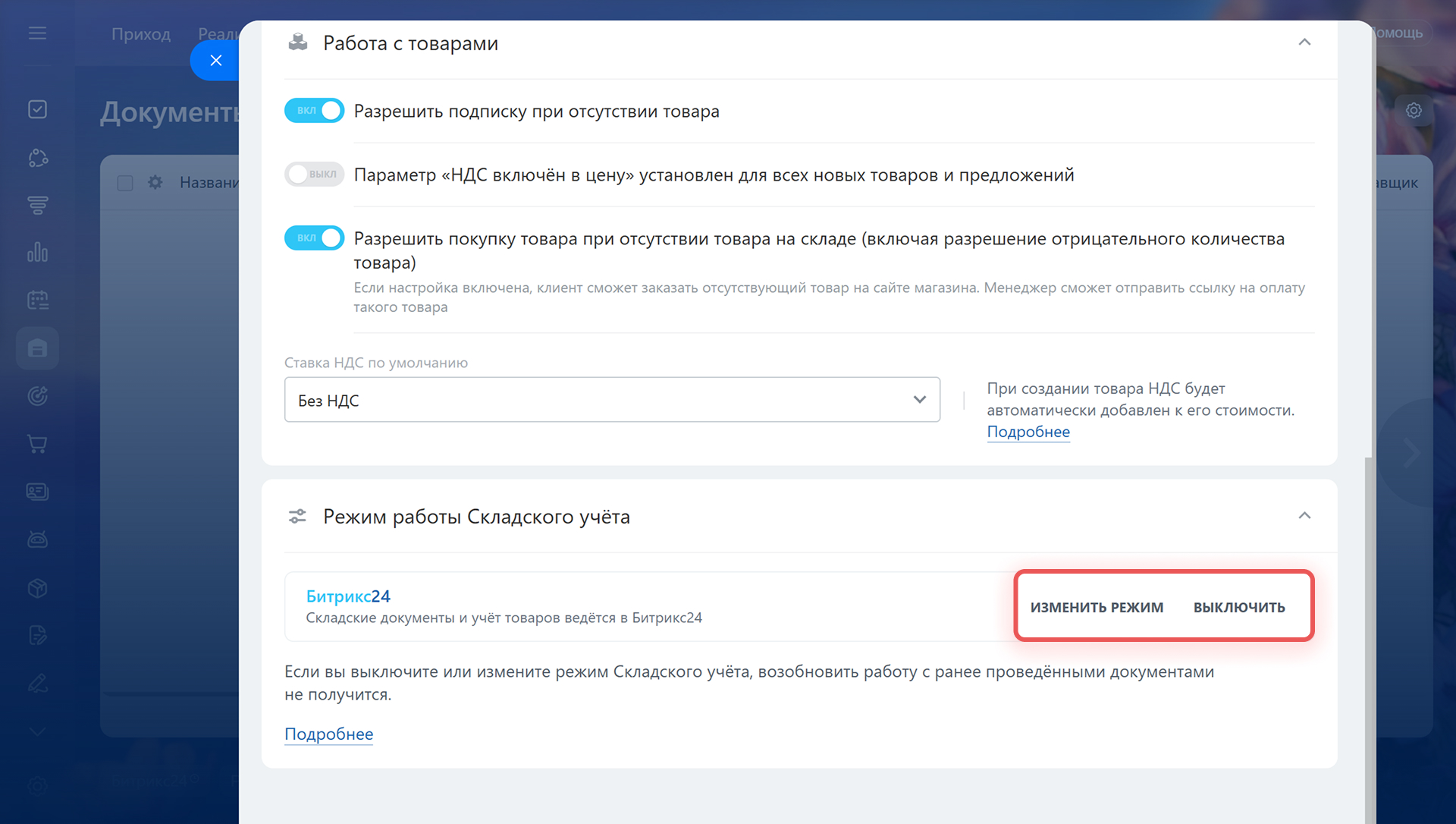 Внизу страницы вы увидите пункт «Изменить режим/Выключить». При отключении складского учета все складские документы и остатки товаров по складам в Битриксе будут удалены. Это значит, что при повторном включении вы не сможете продолжить работу с ранее проведенными документами.