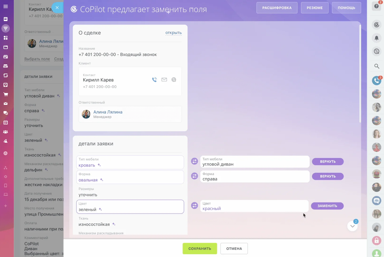В CRM Копилот сам обработает звонки и возьмет на себя рутинную работу. Он расшифрует запись разговора, выделит главное и автоматически заполнит поля в CRM. Менеджерам больше не нужно прослушивать звонки — CoPilot предоставит текстовую расшифровку и резюме с ключевыми моментами, чтобы помочь быстро подготовиться к следующему звонку.