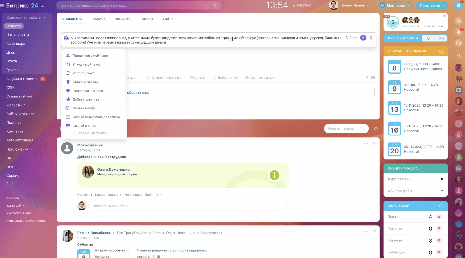 Copilot Bitrix24 помогает быстро и точно ставить задачи. Просто набросайте черновик, и AI-ассистент превратит его в четкое описание с чек-листом. Он также прочитает все комментарии, выделит главное и подготовит ответ. С помощью заранее подготовленных препромптов вы сможете быстро создать задачу или ответить на комментарии.