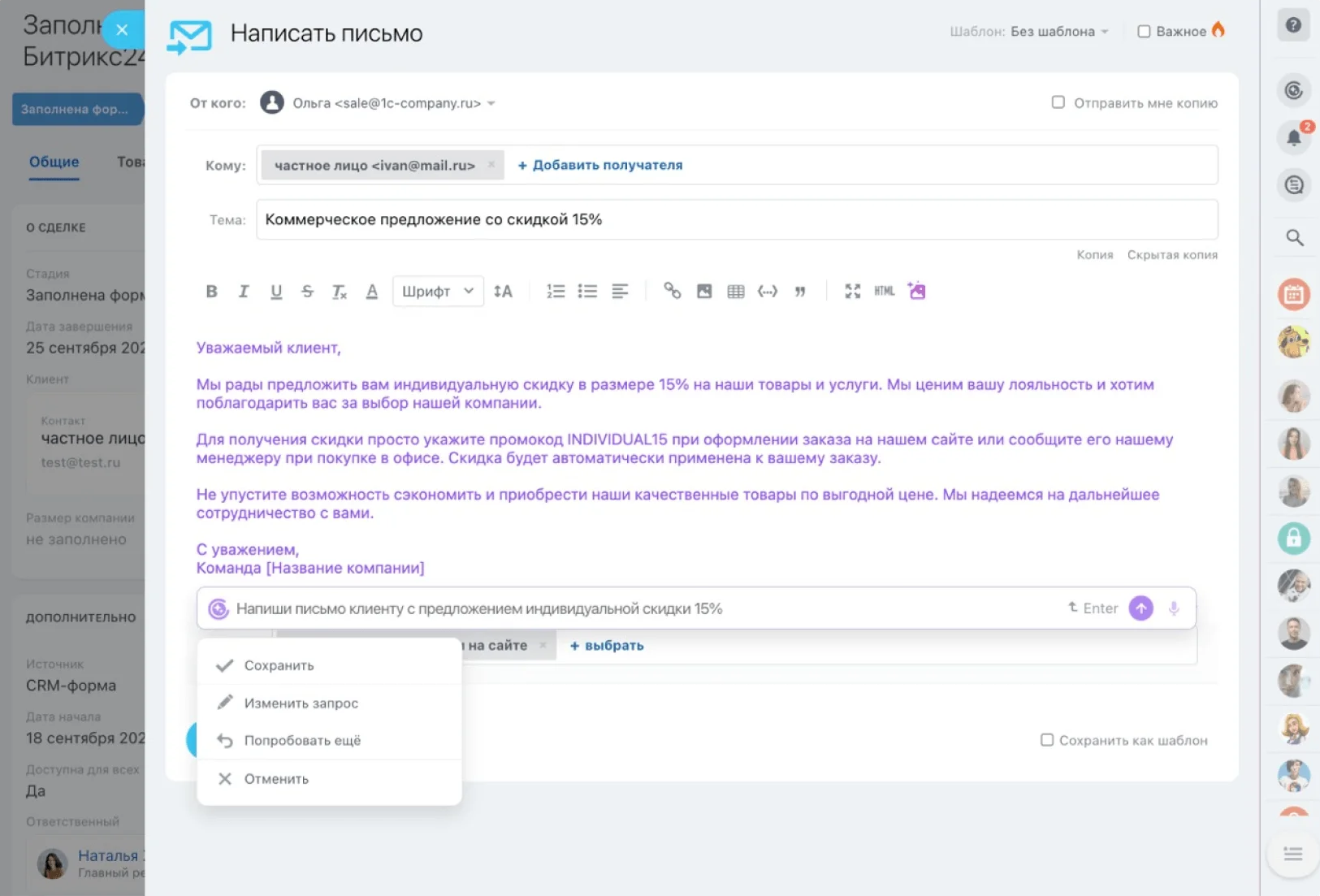 AI CoPilot в Битрикс поможет легко создать текст для вашего сайта. Он напишет текст за вас или отредактирует уже готовый. CoPilot быстро подготовит статью, новость или описание для вакансии. Просто укажите что нужно, и AI-ассистент сделает все за вас. А с помощью препромптов вы можете сделать текст короче или длиннее, а также поменять его стиль всего в несколько кликов.