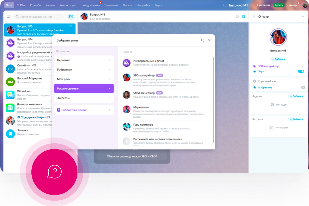 CoPilot может взять на себя роль маркетолога, юриста, HR или руководителя отдела продаж. Он подскажет варианты решения задач и предложит креативные идеи для вашего бизнеса