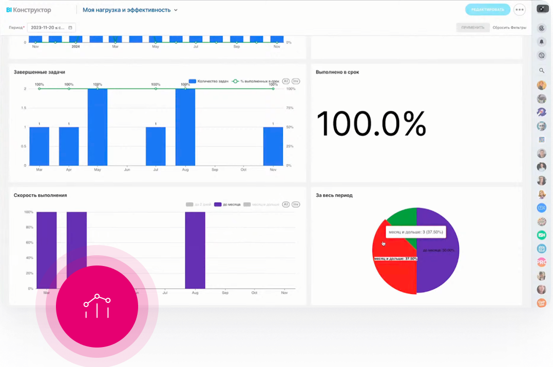 Отслеживайте, как движутся сделки, кто из менеджеров перегружен, где теряются клиенты и выполняется ли план продаж. Все данные обновляются в реальном времени