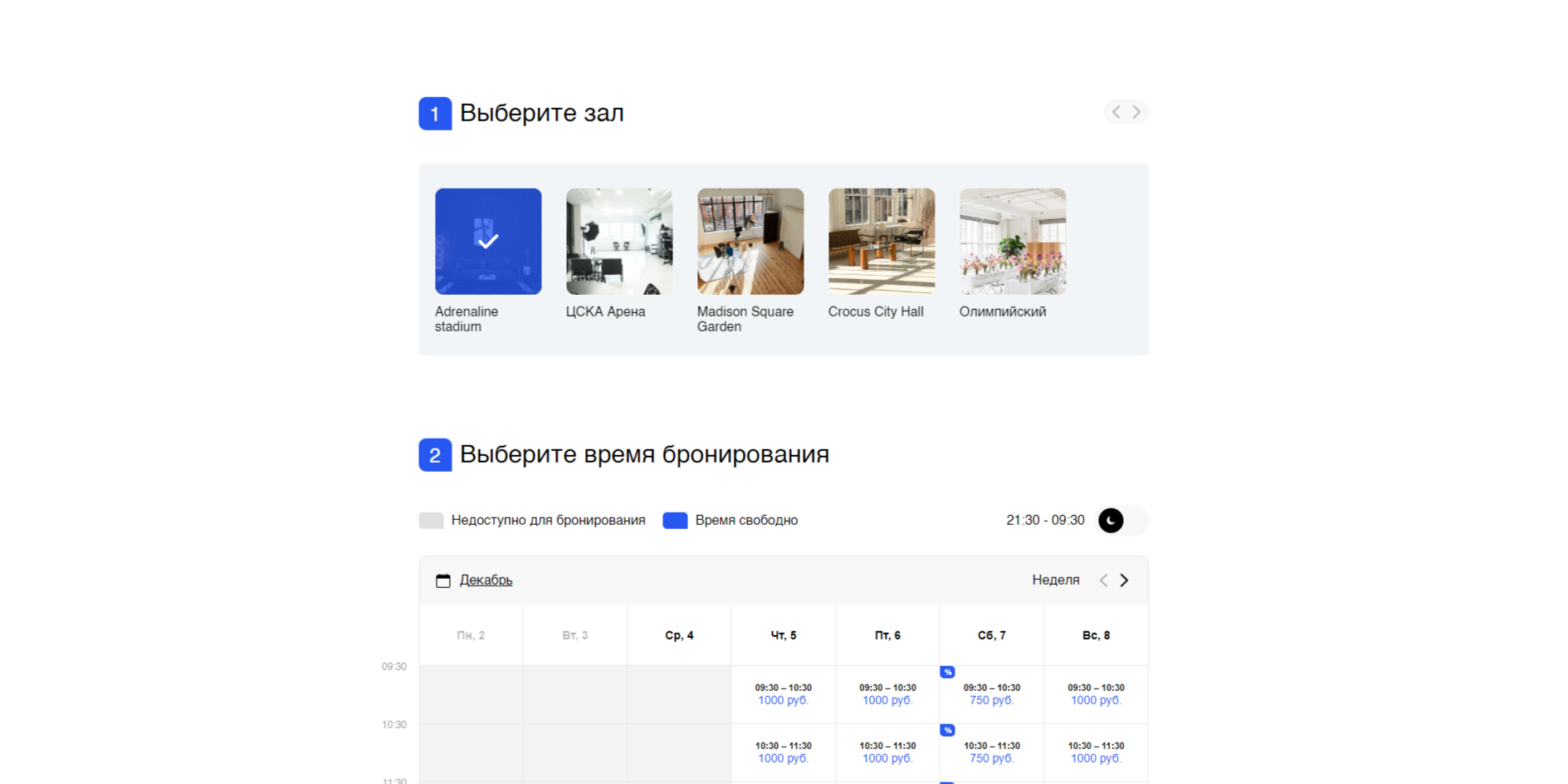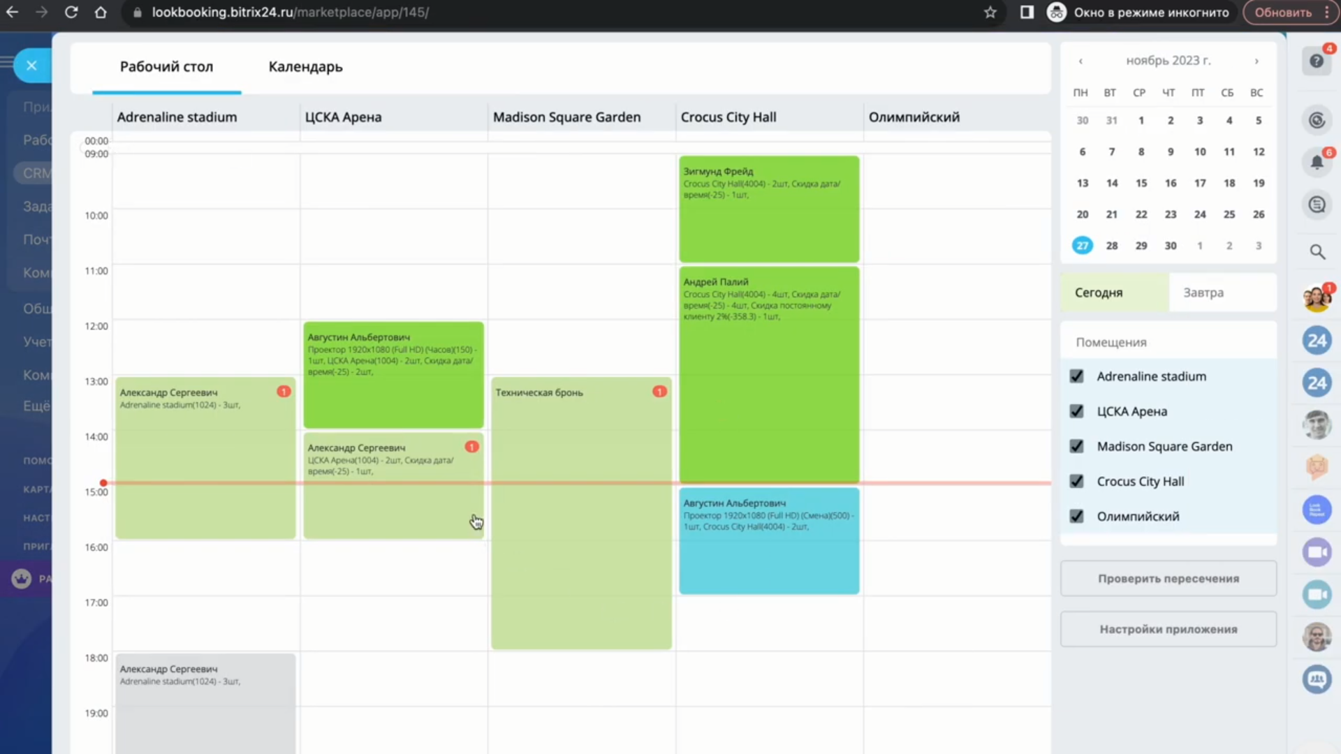 Рабочий стол — это ваш центр управления бронированием. Здесь вы увидите все текущие брони, разнесенные по времени и помещениям. Календарь бронирования помогает быстро найти нужный слот и внести новые записи. Также система напоминает о делах и обязательных процедурах для каждого клиента.
